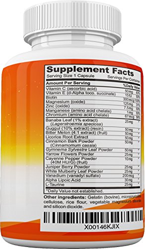 -. Feature : Cinnamon has been found to cut cholesterol by about 18% and blood sugar levels by 24% in some researches / Chromium also helps to maintain a normal blood sugar level. / B-Complex Vitamins - Biotin is essential in boosting body metabolism and healthy growth. It also helps optimize utilization of carbohydrates, fats and proteins / Vitamin C Helps reduce the level of sorbitol that is destructive to the cells of the eye and nerves / 100% Money Back Guaranty! Also contains Zinc oxide. Manganese, Chromium, Banaba Leaf, Gul, bitter melon, licorice root, gelatin, vegetable magnesium stearate, silicone dioxide, and rice flour