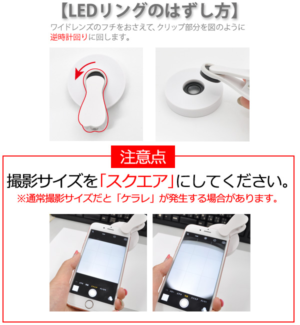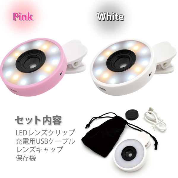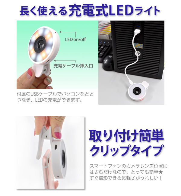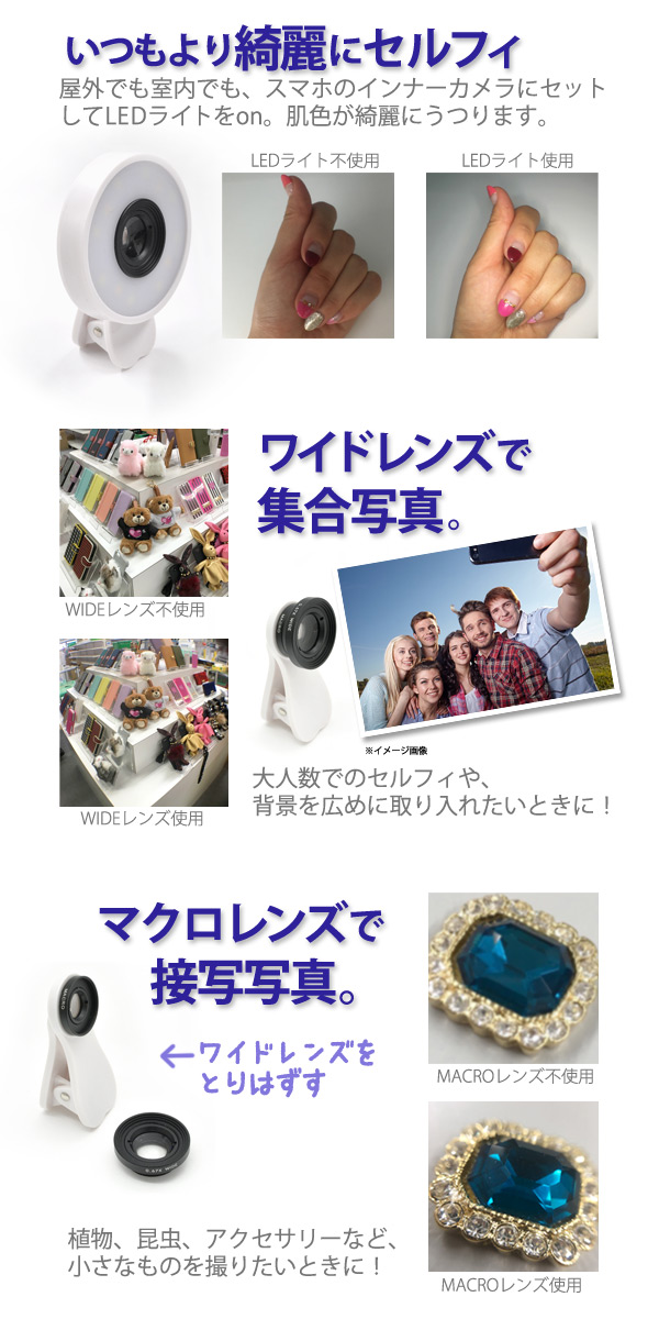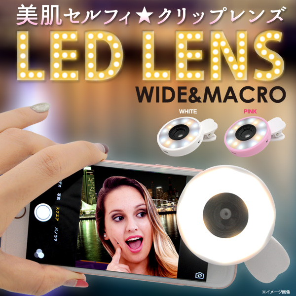 LEDライトがついたセルカレンズ!屋外でも室内でも、スマホのインナーカメラにセットしてLEDライトをON!肌色が綺麗にうつって美肌セルフィに最適!