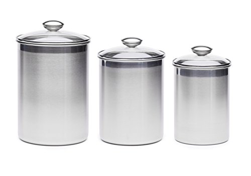 +STEEL XL CANISTER SET INCLUDES: 3 Canisters with Tempered Glass Lids and two Scoops. Canister Sizes are 3.9Qt, 2.8Qt, 1.8Qt. Scoop sizes 1 Tbsp and 2 Tbsp. Hand Washing Recommended.