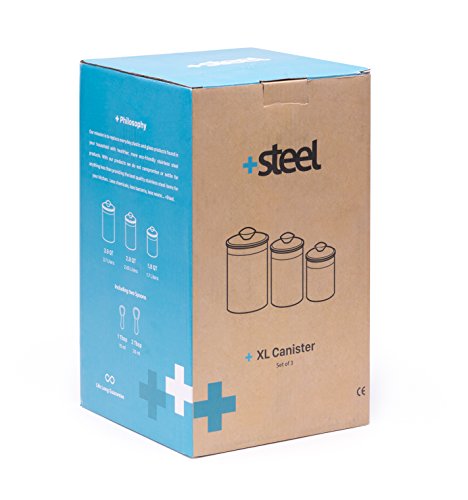 GREAT FOR COFFEE, TEA, SUGAR – The +Steel XL Canister Set is a perfect canister set for coffee, tea, sugar, flour and etc. Larger than our standard Canister Set with the smallest canister being the large size from the standard set.
