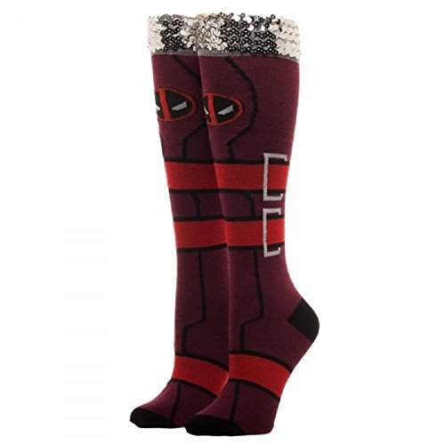 Product Description Marvel Comics Deadpool Logo Sequin Cuff Knee High Socks. Design features styling inspired by your favorite un-superhero Deadpool on a high quality knit Knee High Sock with metallic silver sequins. 0