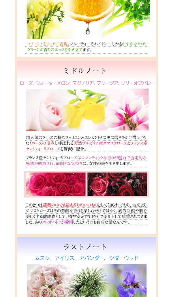 トップノート/フリージア、マンダリン、ライチ、ピオニー、セロリ ミドルノート/ローズ、ウォーターメロン、マグノリア、フリージア、リリーオブバレー ラストノート/ムスク、アイリス、アバンダー、シダーウッド