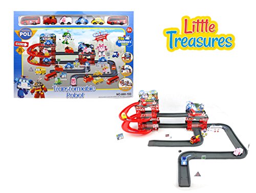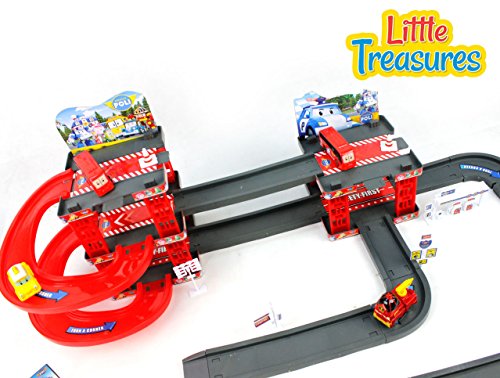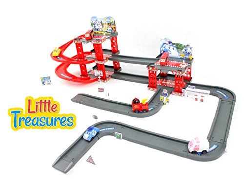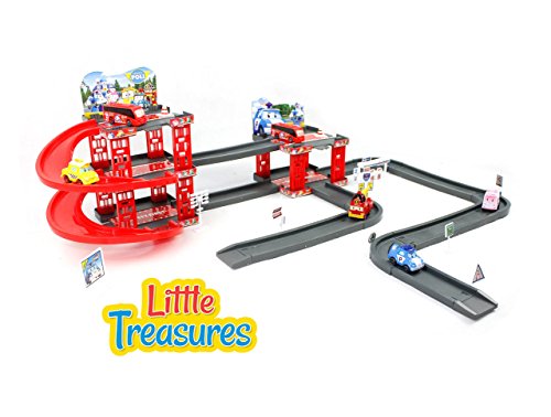 Garage toy kit for children to play and have fun. This garage set includes six brightly colored vehicles: Two buses, a police car, taxi, fire truck, and ambulance.
