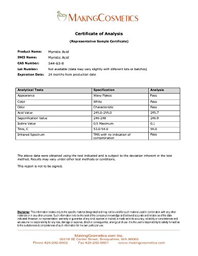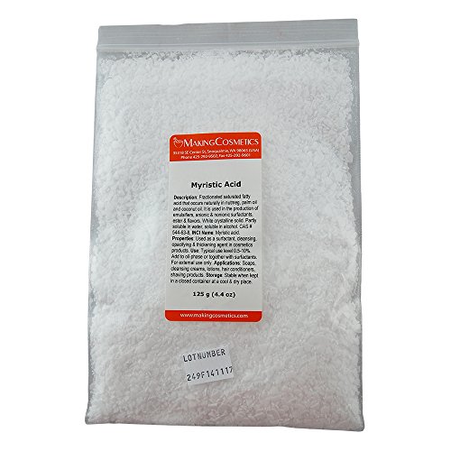 -. Feature : Cleansing, Opacifying & Thickening agent / Note: Item is Non-Returnable, Consists of Raw Materials / For External Use Only, This is a Cosmetic Ingredient, Not a Finished Cosmetic Product / Description: Also called tetradecanoic acid, myristic acid is a fractionated saturated fatty acid that occurs naturally in certain fats and oils including nutmeg butter, coconut oil, and palm oil. Nutmeg, palm oil and coconut oil contain high levels of myristic acid. It is used as raw material in the production of lsifiers, anionic & nonionic surfactants, ester & flavors. Saponification value 243-249. White crystalline solid. Partly soluble in water. Soluble organic solvents such as ethanol, DMSO, and acetates. CAS: 544-63-8. INCI Name: Myristic acid. Properties: Myristic acid is used as a surfactant, cleansing, opacifying & thickening agent in cosmetics products. Has also lsifying properties. Use: Add to oil-phase of formula or in phase with surfactants. Typical use level 0.5-10%. For external use only. Applications: All kinds of personal care products including soaps, cleansing creams, lotions, hair conditioners, shaving products.