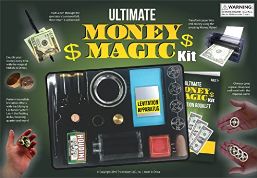 Money magic is one of the most versatile types of magic there is so it's only natural that it can be used for some of the most amazing tricks that one can do. Here are the tricks that are in the kit : Nickels to Dimes - A stack of four nickels is changed into four dimes! Coin thru Glass - A coin visibly penetrates a glass! Flying Coins - Coins mysteriously travel from one goblet to the other! Crystal Coin Case - A coin is placed inside a clear plastic case and made to vanish and reappear! Magic Matchboxes -A borrowed and marked coin is made to appear within a sealed bag inside of two sealed matchboxes! Magic Pen Penetration - A borrowed bill is penetrated by a solid pen. The pen is removed and the hole is magically healed! Ultimate Penny to Dime - A penny is placed on the back of a spectator's hand. The magician taps the penny with a pen and it instantly becomes a dime! The Money Maker - A piece of blank paper is placed between the rollers and magically prints a real dollar bill in the process. Folding Paper Mystery - A dollar bill is placed in the center of a piece of paper and folded into a packet of different colored papers. When the papers are opened, they are found to be empty - the bill has vanished and can be made to reappear! The Imperial Coins - With these coins, you can cause coins to vanish, go through table tops, travel from one hand to the other, and much more! Top Secret Vanishing Device - Use this to make a handkerchief appear and disappear, change a one dollar bill into a one hundred dollar bill, plus a number of other magical effects. The Ultimate Levitation System - With this system you can cause bills or credit cards to float in the air, travel from one hand to the other, and even spin around your body! Also included is an instruction book with lots of bonus magic plus access to a secret website with instructional videos and bonus downloads! 0