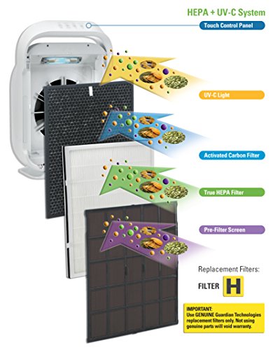 -. Feature : True HEPA Filter captures 99.97% of dust and allergens as small as .3 microns such as household dust, pet dander, mold spores and plant pollens. Activated granular carbon filter reduces odors from pets, smoking, cooking along with harmful VOC's emitted from a variety of household products and chemicals. / UV-C light technology works with Titanium Dioxide to kill airborne bacteria, viruses, germs and mold spores. / High-performance CADR ratings of 244 (smoke), 310 (dust) and 346 (pollen) making it excellent for any room size up to 378 square feet. / Ionizer option can be turned on/off. When on, it helps boost allergen control by attracting microscopic particles from the air which are then captured by the True HEPA filter. / IMPORTANT: Use GENUINE Guardian Technologies replacement parts to maintain product performance and warranty. Only one single filter needs to be replaced every 6-8 months depending on the use of the product; Replacement filter is filter H - Model FLT9200 (ASIN B017ANUUWM). Voltage: 120V 60Hz