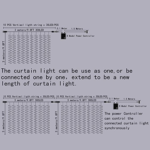 1.The main curtain light can be used as one, and multiple curtain light also can be linked one by one, change to be a different length of curtain light according to your need(at most 8 PCS light to form 24m*3m curtain light).