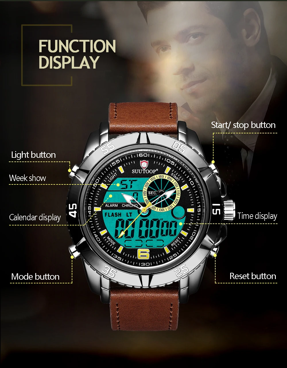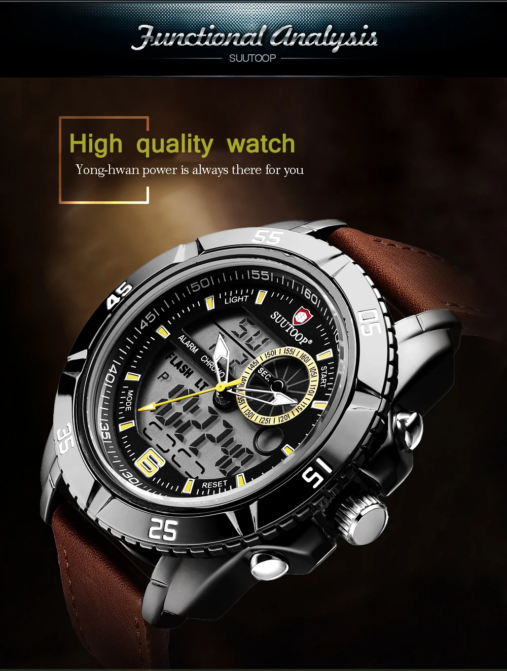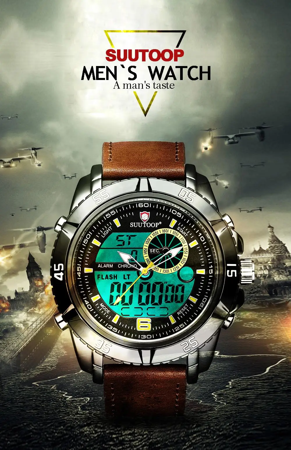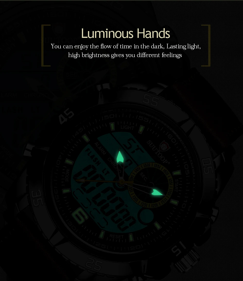Feature:Complete Calendar,Shock Resistant,Week Display,Water Resistant,Stop Watch,Back Light,LED display,Alarm
