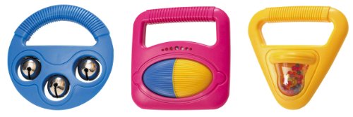 Three different music making shapes with infant easy grasp handles. Packaged for easy gift wrapping - assorted colors.