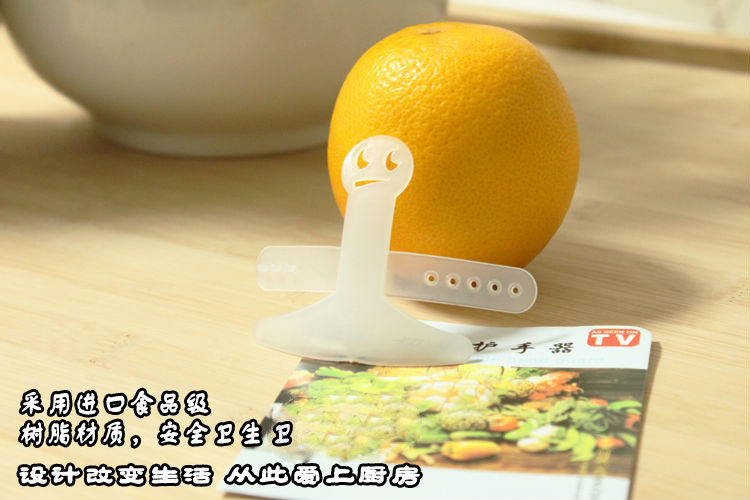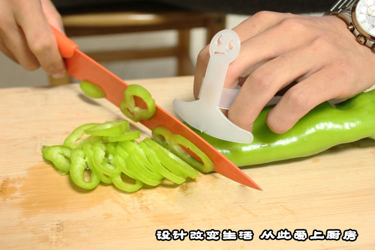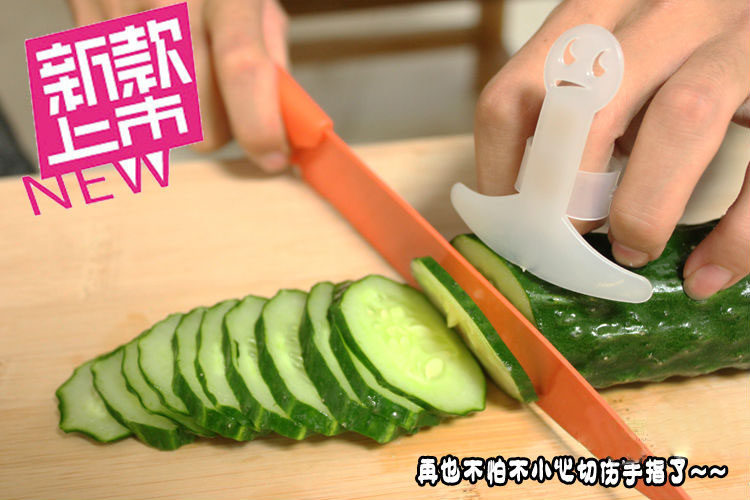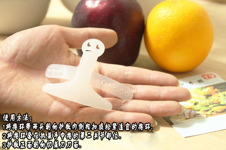 最新出品的带有搞怪笑脸图案的切菜护手器。烹饪时要处理食材、要切菜,切菜容易切伤手指,即便是经过专业训练、技艺娴熟的人,也难免发生伤手意外。中国民间有句谚语:“武功再高也怕菜刀”,说的就是此意。有了本款切菜护手器护手,就能从根本上避免了手指受伤。使用时将护手器扣套在手指上,使握执食材的手指处在护板后面,从而实现了对手指的保护,而且不影响手指在握执食材以及切菜动作的灵活与协调。由于采取了指环扣带连接护板的结构设计,加之使用环保安全的塑料制造,因而具有结构简单、美观实用、使用方便安全的特点。本品也是送给妈妈、老婆的最温馨的好礼品。