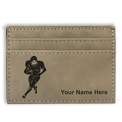 -. Binding : Apparel -. Brand : SkunkWerkz -. ClothingSize : Medium -. Color : Light Brown -. Department : mens -. EAN : 0654975838733 -. Feature : The Money Clip Wallet is laser engraved with the image that you see in the photo. / Your name or personalized message will be engraved on the wallet for free. / Synthetic leather construction. Includes space for 3 credit cards. / You may have one line of engraved text - 20 characters maximum. / Click the "Customize Now" button to begin customizing your wallet. -. ProductGroup : Apparel -. ProductTypeName : ACCESSORY -. Size : Medium -. Title : Money Clip Wallet - Football Player - Personalized Engraving Included (Light Brown) -. UPC : 654975838733