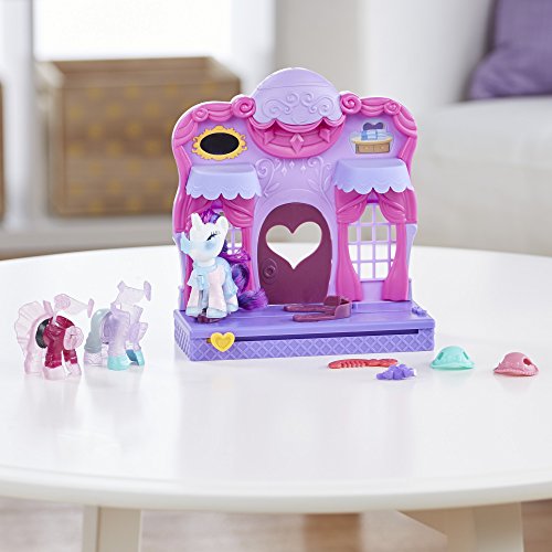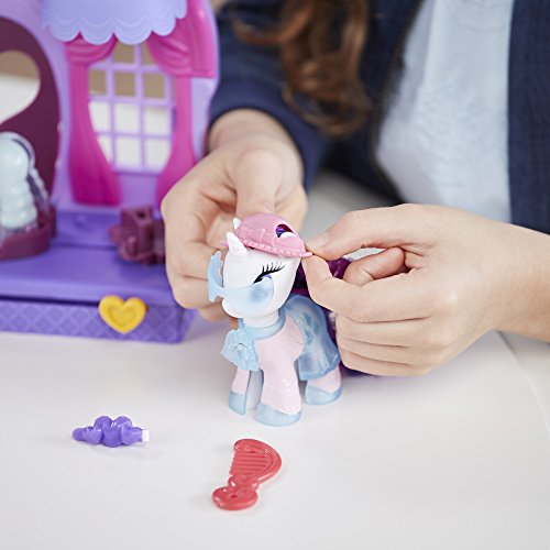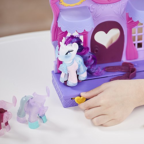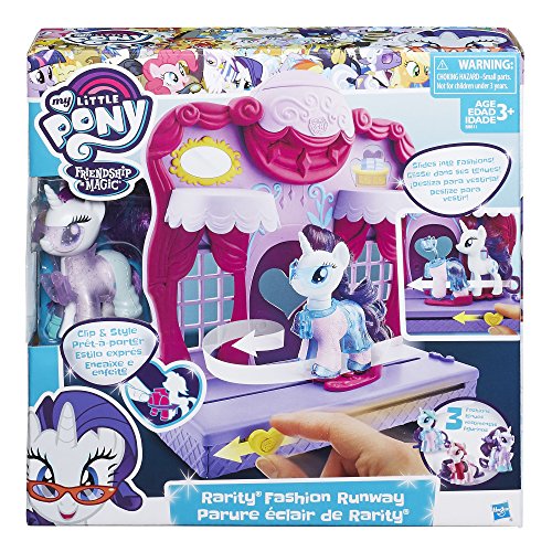 Everypony loves a Rarity original! The Fashion Runway comes with 3 outfits with a clip-and-style feature to dress Rarity by hand or on the playset runway. Place Rarity and her outfit on the fashion runway platform and slide the heart-shaped button to dress the pony figure. My Little Pony and all related properties/characters are trademarks of Hasbro.Feature
