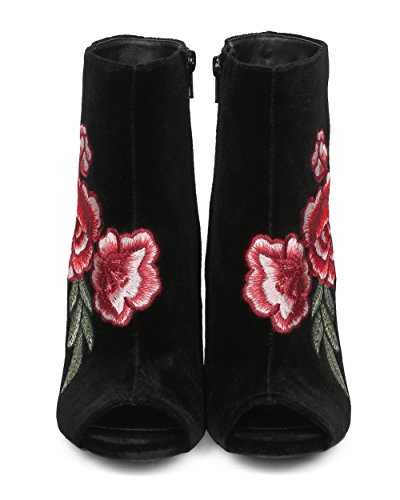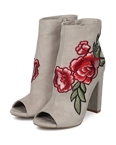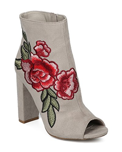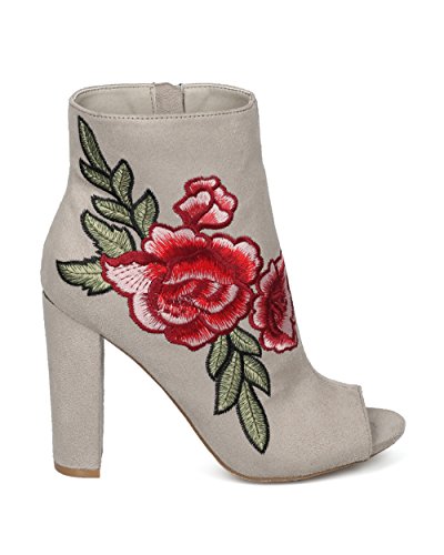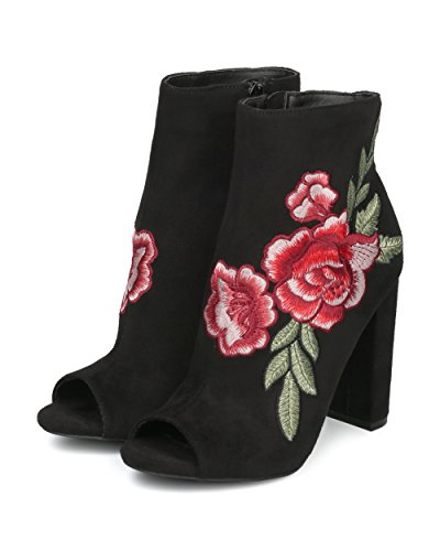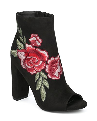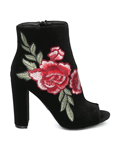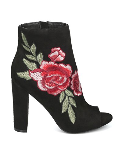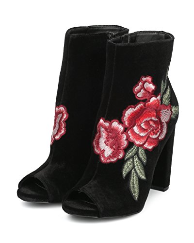 Women Peep Toe Rose Embroidered Chunky Floral Heel Bootie - HF12 By Wild Diva Collection