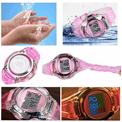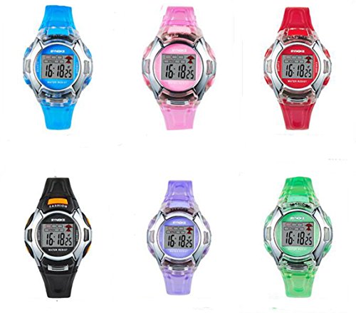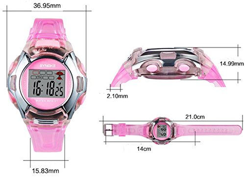 -. Feature : Multifunction: Backlight,alarm,stopwatch,week and digital time display. / High quality elastic PU material band with ABS material case and scratch resistance acrylic mirror surface, sturdy in structure. / Backlight function to show time clearly at night. / Daily water resistance depth to 3ATM, convenient for your daily life. / Ideal sports watches for kids and friends.