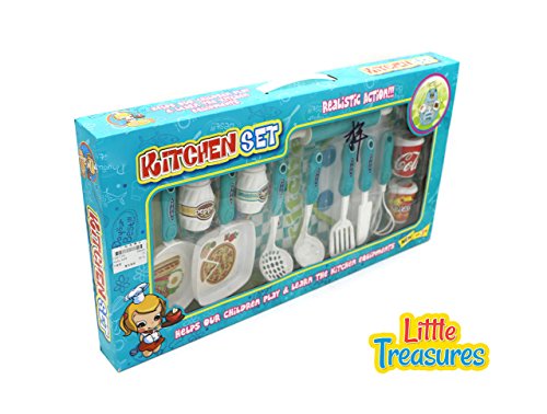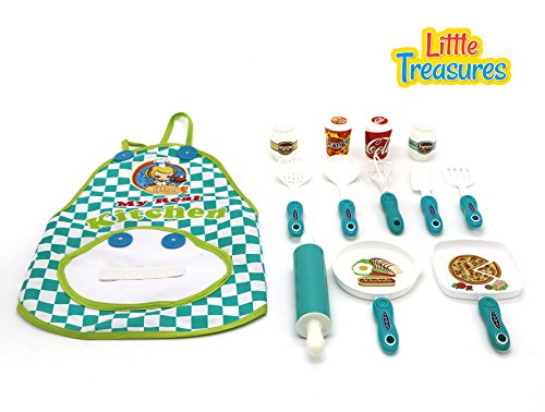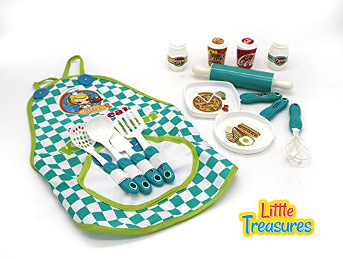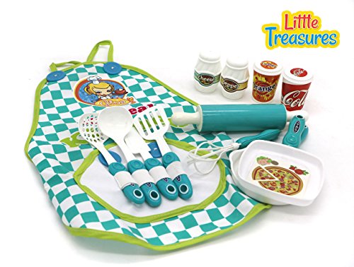 LITTLE TREASURES KITCHEN CHEF BAKER TOY SET FOR CHILDREN 3+ INCLUDES A PRINTED APRON WITH BELT, PIZZA AND FRYING PAN, TYPES OF CUTLERY SPOONS, BREAD PIN ROLLER, PEPPER SHAKER, AND COLD DRINK GLASSES