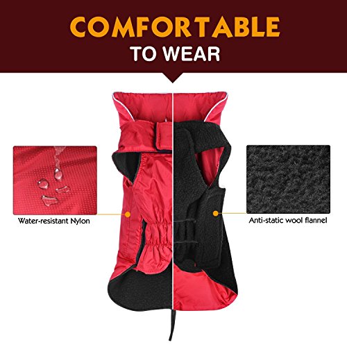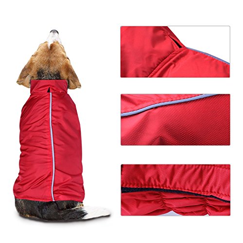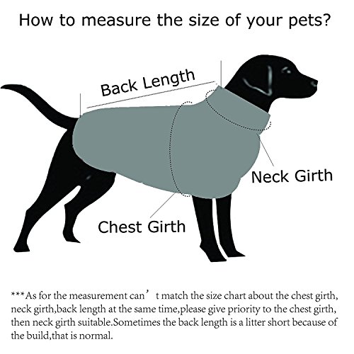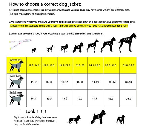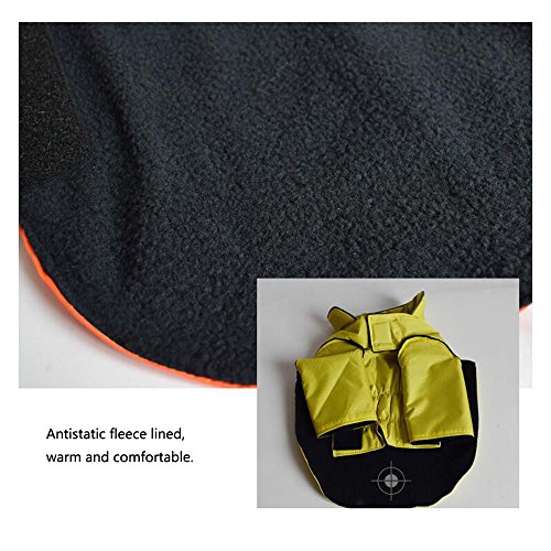 -. Feature : ?WATERPROOF AND WARM?- 100% Polyester,Fleece Lined Jacket,protect your dog in cold wet weather / ?LIGHTWEIGHT,EASY TO BE PUT ON AND TAKE OFF?- Chest and neck have adjustable velcro straps / ?REFLECTIVE PIPING FOR NIGHT SAFETY?- High visibility reflective piping along the back and around the neck of the coat, make your dog more visible and safe at night / ?FASHION DESIGN,EXQUISITE WORKMANSHIP?- Elastic cord design,fit dogs of different bodily shape / ?MEASURE TWICE, ORDER ONCE?- Please measure your dog,GIVE PRIORITY to reference chest girth. NOTE:IF THE SIZE BETWEEN 2 SIZES,OR IF YOUR DOG HAVE A STOUT BUID,PLEASE SELECT ONE SIZE LARGER