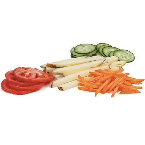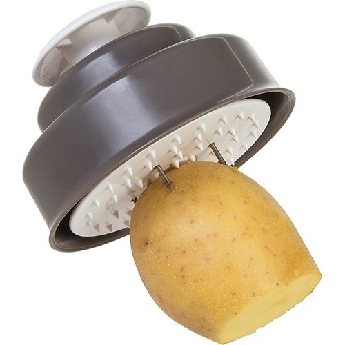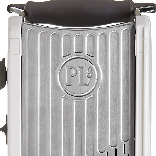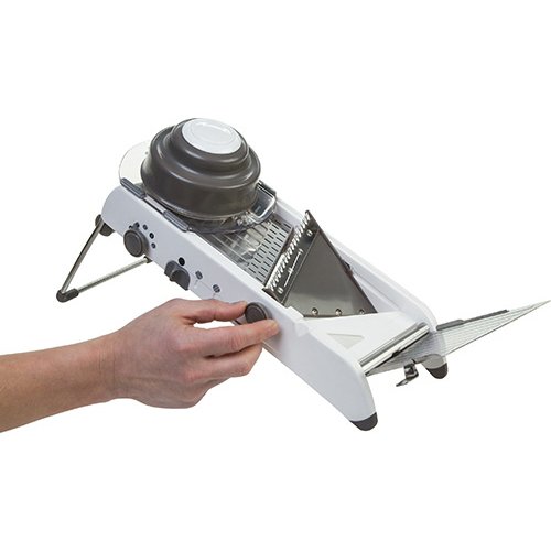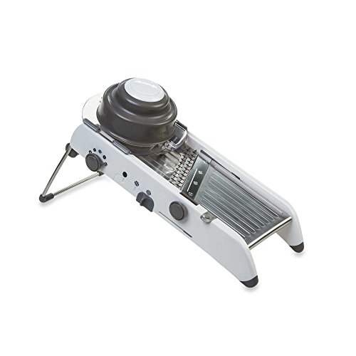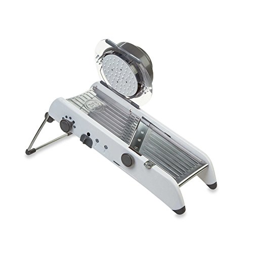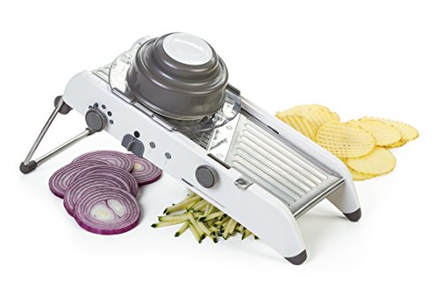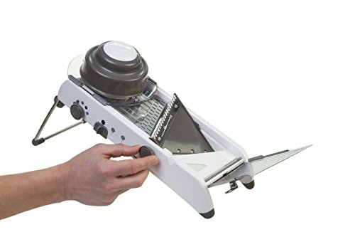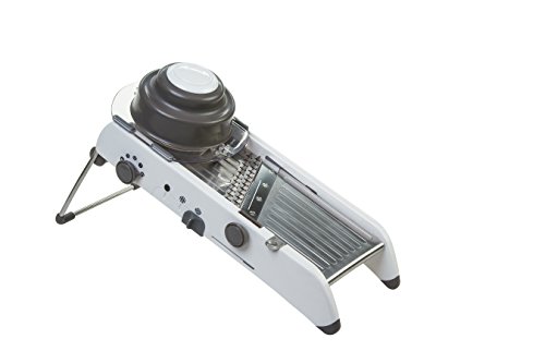 Studio : PL8 Publisher : PL8 Binding : Kitchen Product Description The PL8 Professional Mandoline offers features rarely found in mandolin slicers, such as an extra wide stainless steel slicing deck, a hinged finger guard, a safety hand guard that secures foods for stable slicing and an intergrated blade system that eliminates loose parts. The pro mandolin can slice, julienne and waffle cut in four different thicknesses and all blade options are controlled by simply turning a knob or sliding a switch. Non-skid feet fold under for easy storage in a drawer or cabinet. Materials: ABS, POM, PP, Stainless Steel and TPE. Dishwasher safe. White and gray. 0