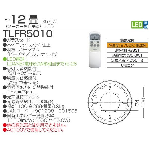 | 仕様 | ガラスセード 本体ニッケルメッキ仕上 羽根リバーシブル(ビーチ色/ウォルナット色) LED電球:LDA×5(電球60W形相当まで)E-26 点灯切替機能付(5灯→3灯→2灯) 風量切替機能付(高速・中速・低速) 羽根回転方向切替機能付(上向⇔下向) ~12畳(メーカー基準) 光束維持率:70% 光源寿命:約40000時間 固有エネルギー消費効率:116.0lm/W(4050lm・35.0W) 簡易取付 色温度:2700K(電球色) 演色性:Ra83 消費電力:35.0W 定格光束:4050lm(810lm×5灯) ※他の調光器とは併用できません。 ※AC100Vで使用してください。 |