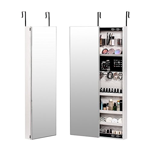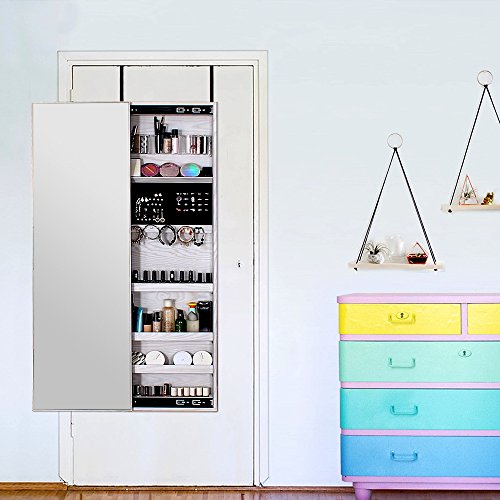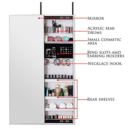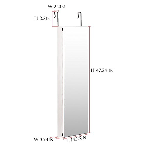 Studio : NEX Publisher : NEX Binding : Kitchen Product Description Specifications: Overall Dimensions: 47.24' X 14.25' X 3.74' Mirror Size: 47.24' X 14.25' Color: White Wood Grain Material: MDF, panel with painting, glass, velvet Volume: Includes 42 ring slots, 35 earring holders, 12 necklace hooks, 5 lined shelves and 3 acrylic semi drums Assembly: Easy assembly required Shipping List: 1* Jewelry Cabinet 1* Instruction 1* double side tapes and some crews 0