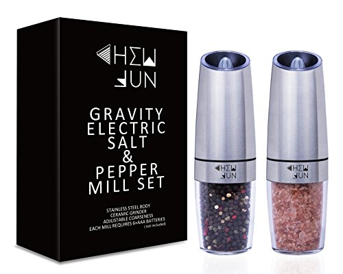 Gravity Electric Salt and Pepper Grinder Set of 2 - Pepper Mill and Salt Mill with Adjustable Ceramic Rotor, Automatic Operation, Blue LED Light, Battery Powered, Brushed Stainless Steel by CHEW FUN