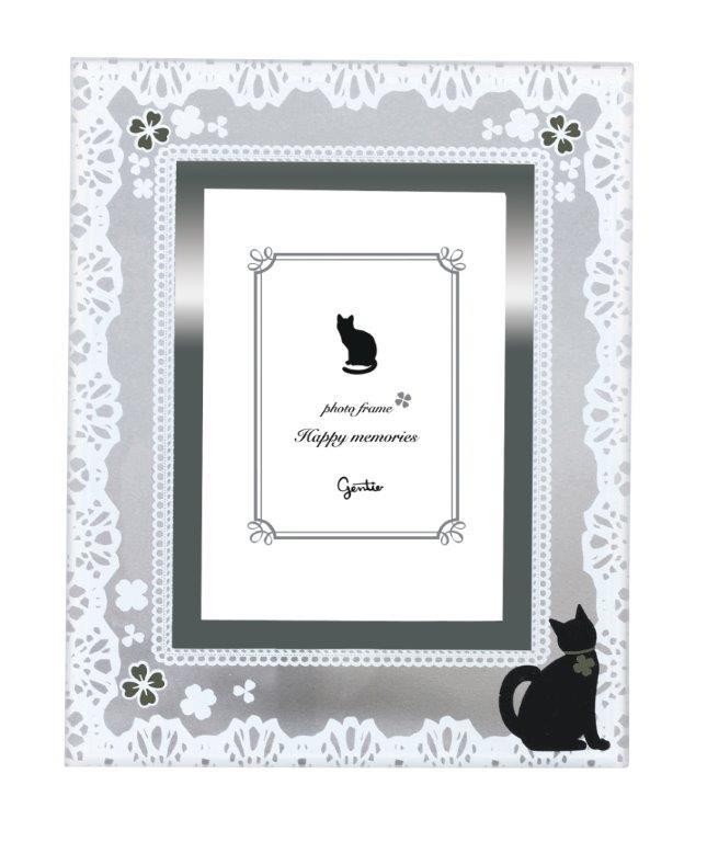 レースの縁取りにちょこんと佇む黒猫がかわいいフォトフレームです。