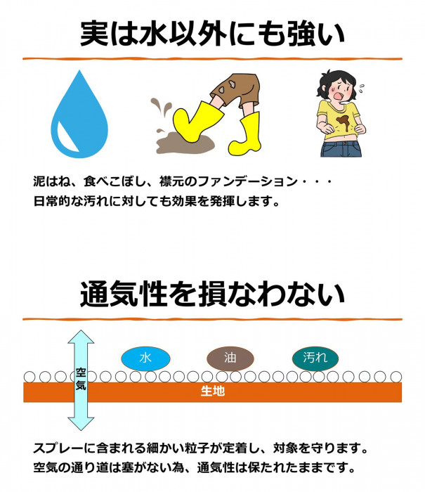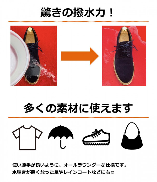 | スーツなどの衣類や革製品、幅広い素材に使用可能な防水スプレー。雨や雪の中で水や油を強力にはじき、シミや汚れを防止します。気孔をふさがないので、通気性・風合いや柔軟性を損ないません。雨具にも使えて、梅雨や雪の時期、雨・雪の多い地域でも活躍します。 |