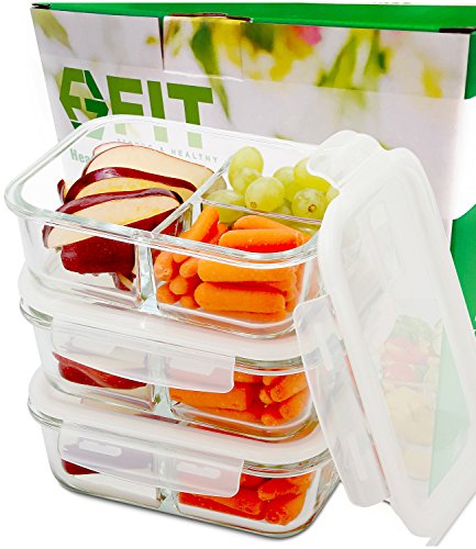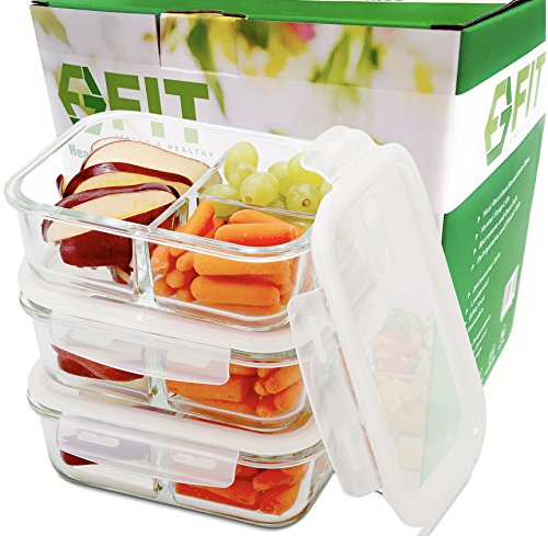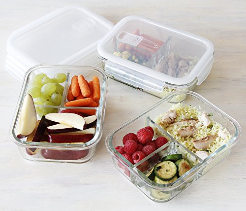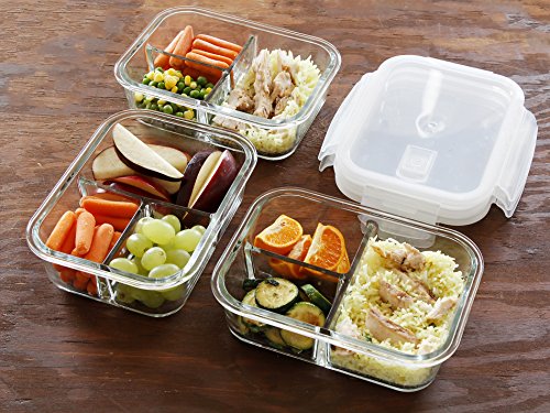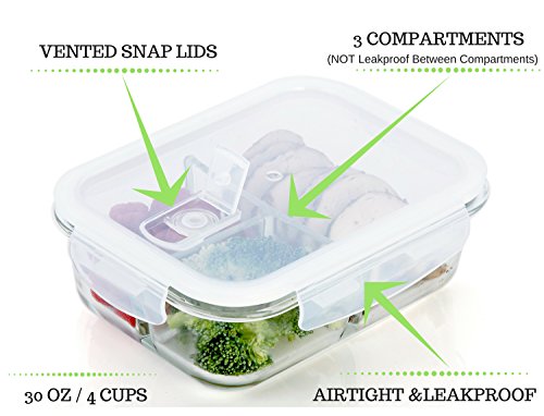 KEEP YOUR PORTIONS UNDER CONTROL: Thoughtfully designed to help keep your portions under control, there portion control containers are essential for healthy meal planning and anyone following a healthy diet. With the purchase of this food container set you’ll get THREE 3 compartment glass meal prep containers with 3 snap locking lids with a VENT feature. The food storage container capacity is 30 Oz (4 cups). Each Glass Container dimensions: 8 x 6 x 3 inches.