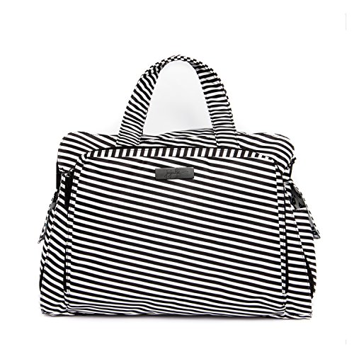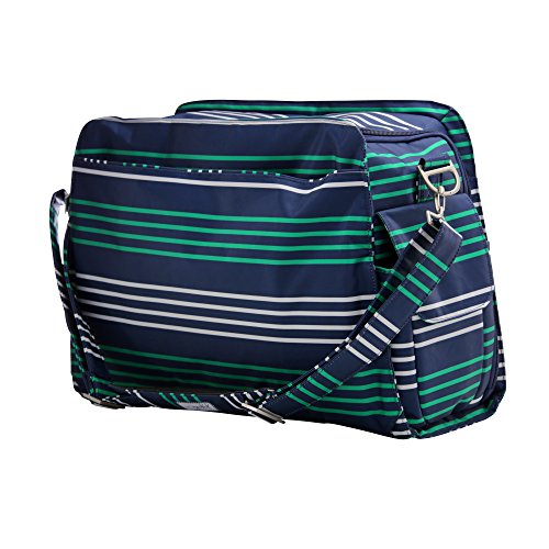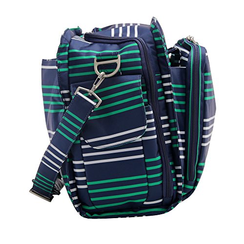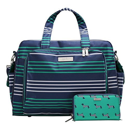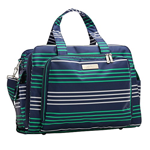 The Ju-Ju-Be Coastal Collection Be Prepared Diaper Bag is a smart bag with innovative designs and spacious compartments. Keep yourself ultra-organized with (17) friendly pockets that make it easy to tote along all your daily essentials. Are you an over packer? Do you have more than one in diapers? Twins? How about the perfect bag for overnight trips or the airplane? The largest in our line of diaper bags, the Be Prepared will help you be just that, prepared. The lining is protected with an Again natural antimicrobial treatment that inhibits and reduces the growth of odor-causing bacteria, mold and mildew. The outer fabric is treated with Teflon fabric protector, making it easy to repel stains and keep it clean. The "mommy" pocket is large enough for smartphones, wallets, keys and other personal items. Inside are (4) pockets with a sunglass holder and a key fob stretch cord. A snap closure pocket is located on the front of the bag and ideal for books. The main zipper pocket is large enough for diapers, wipes, extra clothes and other items. This spacious area also includes (7) smaller pockets with (2) sets of colored tabs to help distinguish different items. The back pocket is designed with crumb drains to keep this area clean and includes a super cushy memory foam changing pad. Bottle pockets with magnetic closure flaps are located on either side of the bag and insulated to keep items hot or cold. This bag is machine washable and measures 18.5-inches by 14-inches by 6.5-inches in size. The Providence print is green and white stripes on a navy background with navy dachshunds with white striped sweaters on a green background for the lining. The print is accented by silver, metal hardware. All Ju-Ju-Be Bags come with a Lifetime Limited Warranty against manufacturing defects when purchased from an Authorized Ju-Ju-Be Dealer. Authorized Dealers can be found in the images.Feature