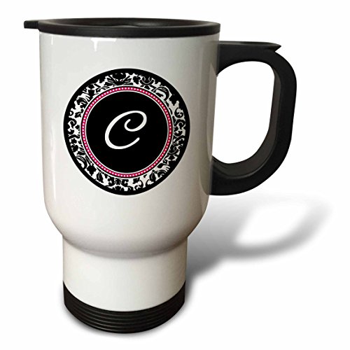 3dRose Letter C Stylish Monogrammed Circle Girly Personal Initial Personalized Black Damask Hot Pink Travel Mug, 14 oz, Stainless Steel, White