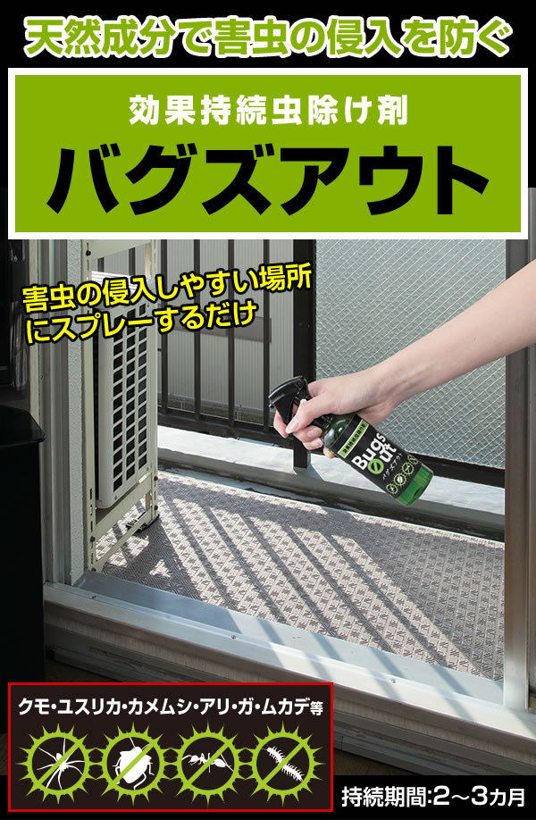 天然由来の防虫成分が家屋の害虫を持続的に防虫します。侵入防止や付着防止にスプレーするだけです。