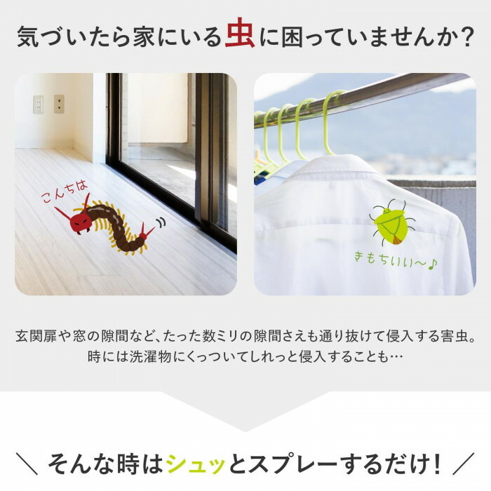 天然由来の防虫成分が家屋の害虫を持続的に防虫します。侵入防止や付着防止にスプレーするだけです。天然防虫剤/ムカデ/カメムシ/アリ/クモ/ユスリカ/蛾/虫除け/ヒノキオイル/寝室の防虫/玄関の防虫/侵入予防/防虫スプレー
