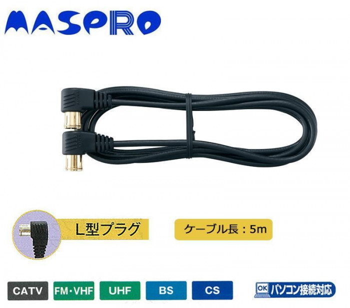 両端L型プラグ付TV接続ケーブルです。4K8K放送に対応!! 製造国:中国 素材・材質:黄銅 商品サイズ:ケーブル長:5m 付属品:取扱説明書 ※サプライヤー直送品 ご注文後2~3営業日後の出荷となります【商品名】マスプロ電工 家庭用TV接続ケーブル 5m TLL5W-P