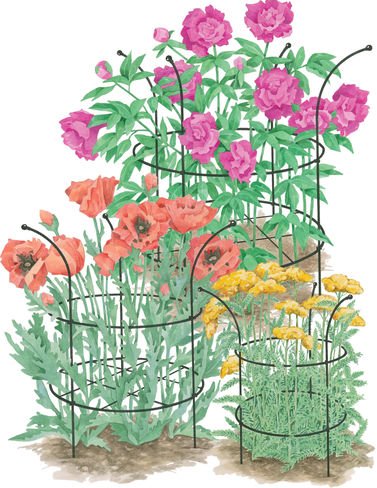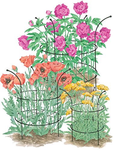 -. Feature : 1/4" powder-coated steel stock (stakes and rings), nylon clips, plastic finials / Small supports are 25" H overall with 14" diameter rings / Great for poppies, some campanula, and globe flowers. Installed height approximately 20".