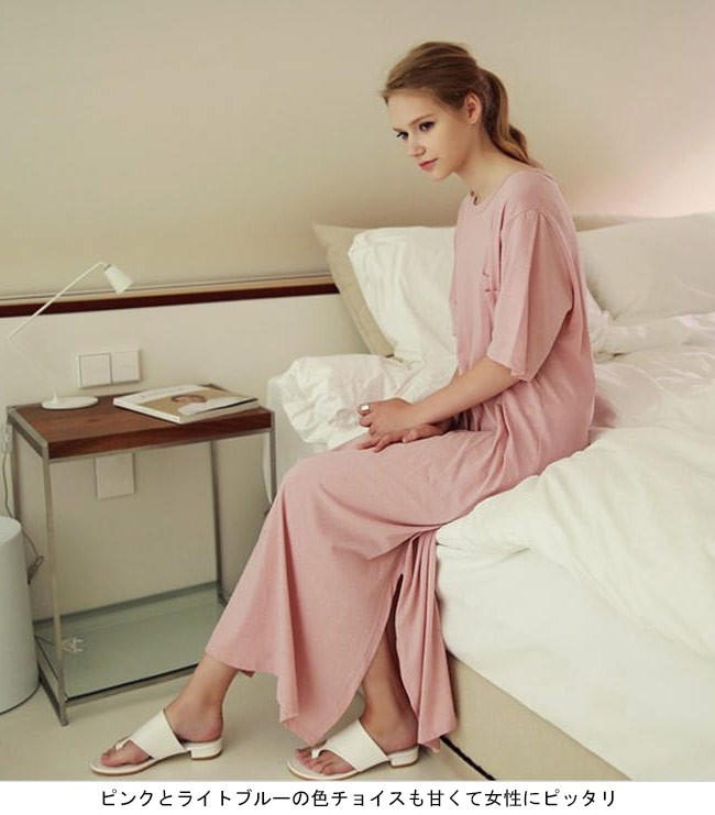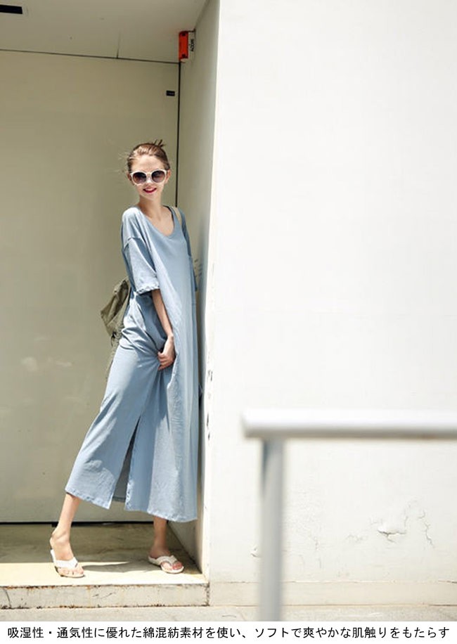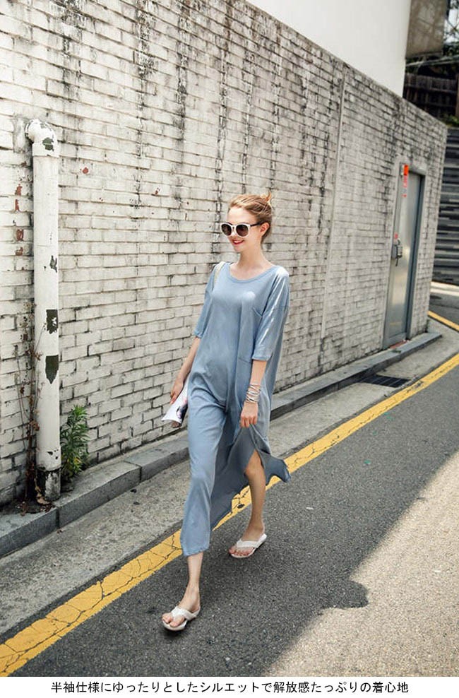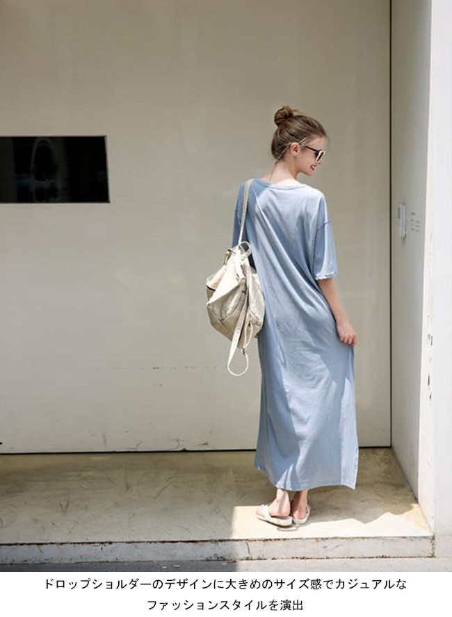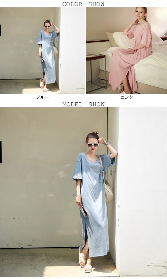 マキシ丈ワンピース 半袖 レディース ゆったり ワンピース ロング カジュアル 女性用 Tシャツワンピ 体型カバー 丸襟 ロングワンピレディース用のTシャツワンピが登場半袖仕様にゆったりとしたシルエットで解放感たっぷりの着心地吸湿性・通気性に優れた綿混紡素材を使い、ソフトで爽やかな肌触りをもたらすドロップショルダーのデザインに大きめのサイズ感でカジュアルなファッションスタイルを演出ピンクとライトブルーの色チョイスも甘くて女性にピッタリ一見シンプルに見えるカッティングは動く度に女性ならではの優雅な雰囲気が溢れ出す上級者ならではの余裕がさりげなく伝わる一枚カラー:ブルー ピンク素材 綿混紡サイズ(cm) M LM 総丈122 バスト105L 総丈122 バスト110ご注意:※サイズは平置きサイズです。素人採寸ですので、若干の誤差がございます、ご了承ください。