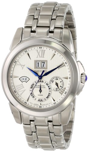 Dress watch, Kinetic movement (wearer's movement powers battery), Power reserve indicator, Perpetual calendar featuring leap year indicator (number of years since last leap year), month subdial and dual panel analog date aperture, 24-hour subdial, Polished marine blue hands, Polished marine blue sweep seconds, Polished marine blue hands mark subdials, Applied polished silver-tone Roman numerals mark even-hour positions, Applied polished silver-tone triangular hour markers, Black print, Arabic numbers and indices mark subdials, Black Arabic numbers and indices form minute track on surrounding concave ring, Double-layer matte white dial with pinstripe texture and polished silver-tone logo applique below twelve o'clock position, Brushed silver-tone stainless steel bracelet with polished detailing, adjustable links and push-button-clasp, Polished silver-tone stainless steel bezel, Brushed/polished silver-tone stainless steel round case, Textured steel/blue cabochon crown, Stainless steel screw-down caseback, Sapphire crystal, 10 ATM (100 meters/330 feet water resistant)Feature