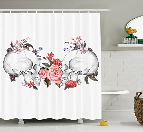 Ambesonne Gothic Decor Collection, Roses and Skull Feast of All Saints Catholic Tradition Illustration Art Print, Polyester Fabric Bathroom Shower Curtain Set, 75 Inches Long, Coral Lilac White