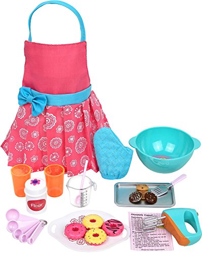 A great pretend play for your kids set comes with a variety of baking utensils and bakers clothing for dolls. This cute activity toy is a great way to encourage creative play and motor skill development. Compatible for 18 inch dolls like the American Girl.