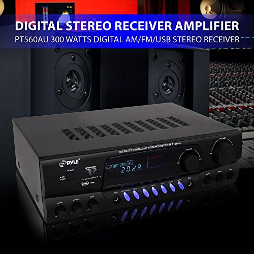 Get the music flowing with this 300 watt, digital AM/FM stereo receiver with a USB port for digital music playback. Store up to 50 presets, power two sets of speakers thanks to the A/B switch, and plug in a USB drive with MP3s to listen to your favorite digital music. Inputs include 3 stereo RCA inputs on the back, plus two ¼" mic-jacks on the front - so it's perfect for singing along to your favorite music. A wireless remote control gives you full access to the receiver's settings from your couch. Runs on both 110 and 220 V.Feature