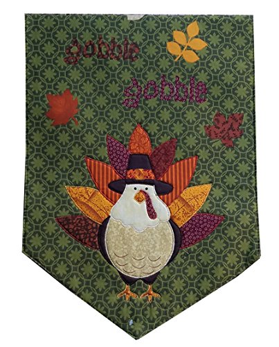 Product Description Thanksgiving turkey appliqued fabric table runner. Measures 13 x 36 inches. A colorful turkey at each end decorates the runner. Reversible. Opposite side is a solid green fabric. The face is 100% cotton. Back is 85% polyester and 15% cotton. The fill is 100% polyester. Machine washable and can be tumbled dry. Add this cute turkey runner to your table this Thanksgiving Season. 0