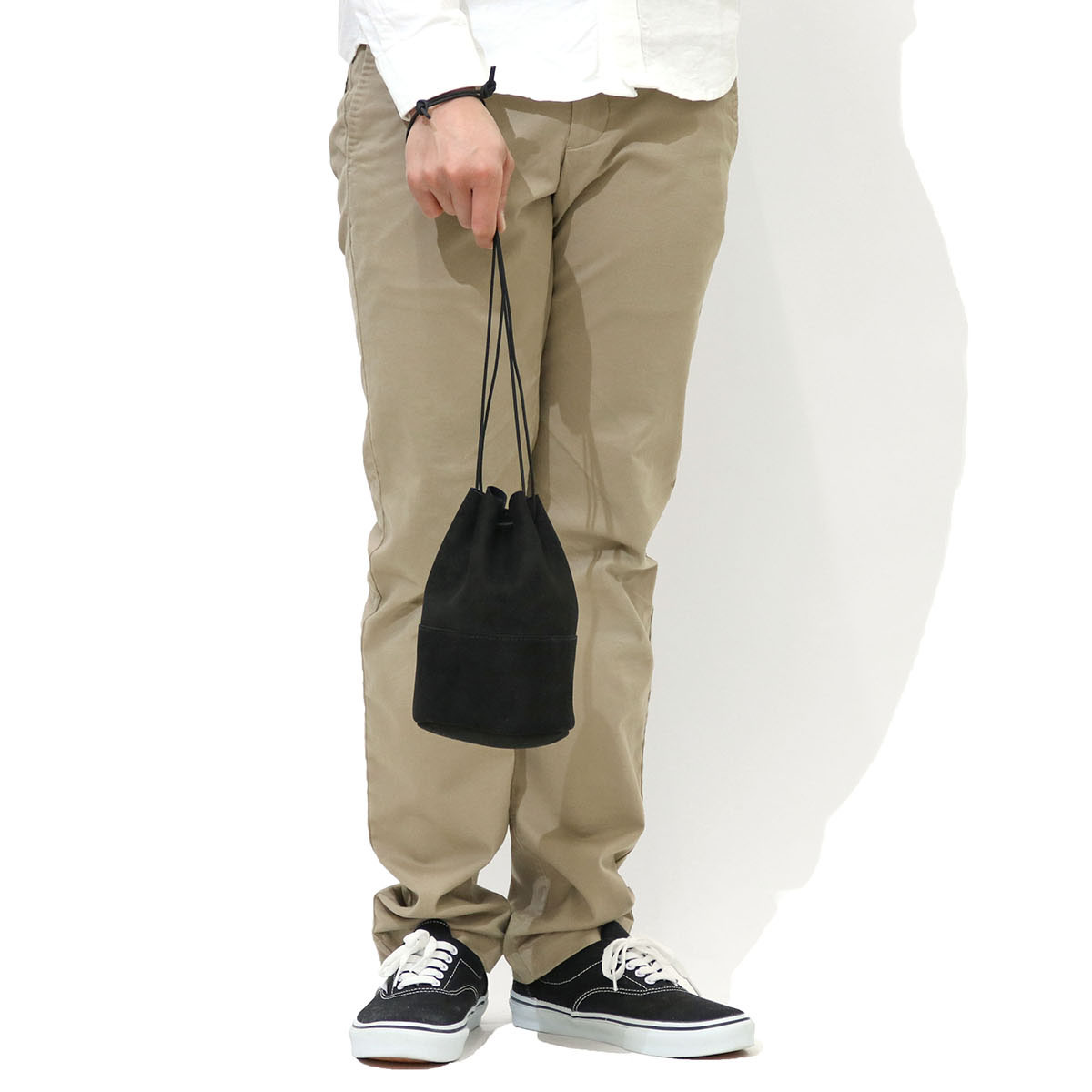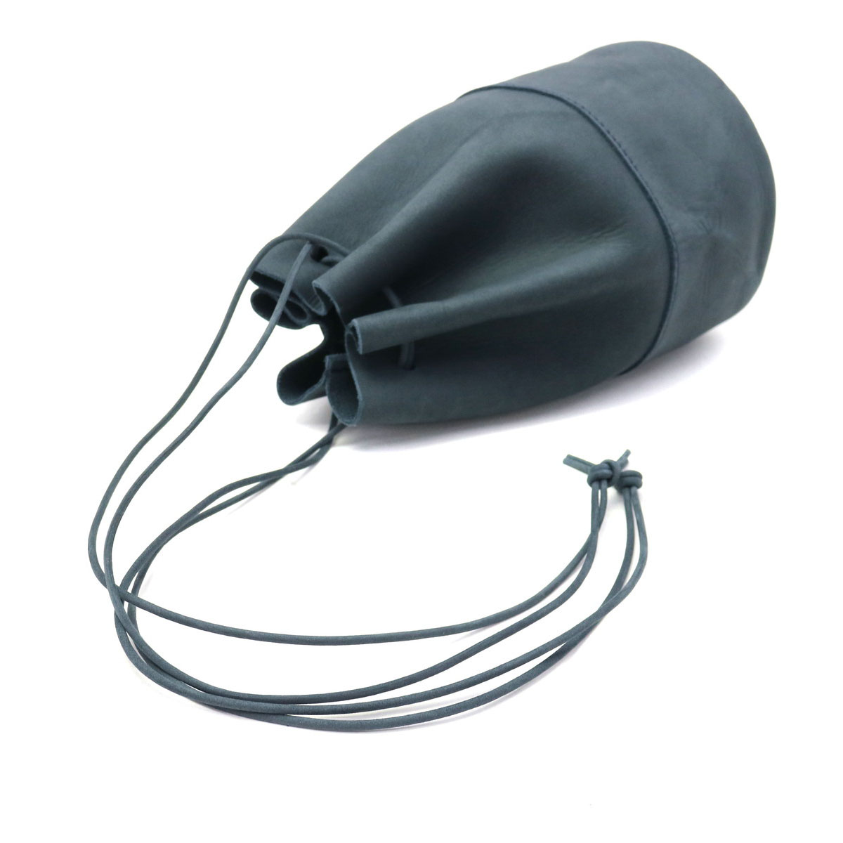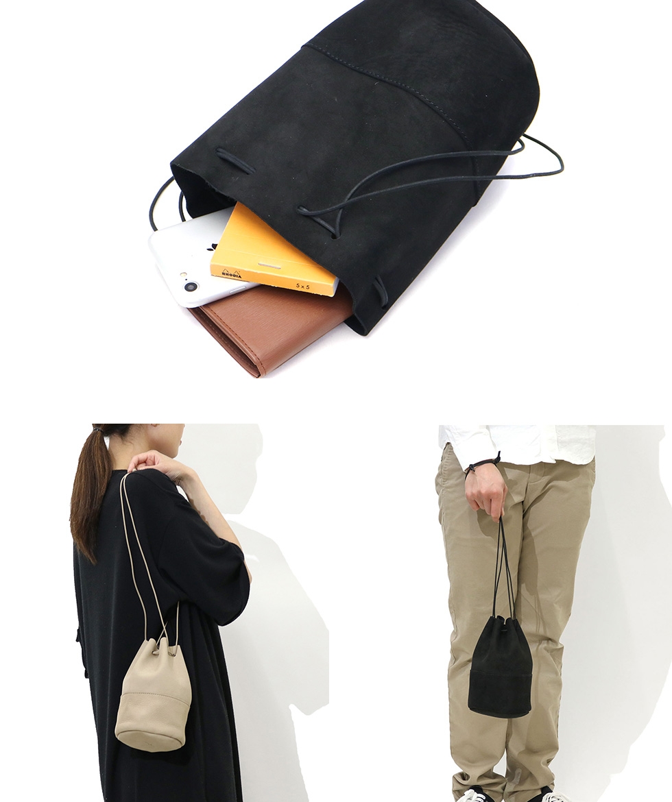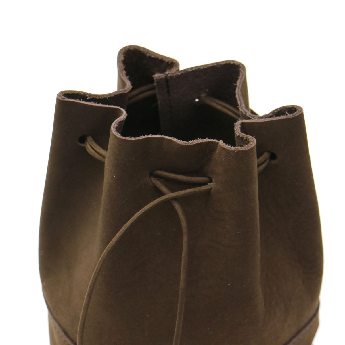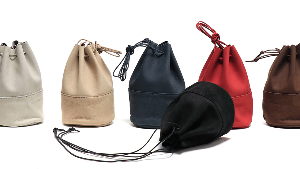日本古来から使われている巾着袋をヒントに、現代の装いに合わせてシンプルかつ愛着が湧くようなデザインにした巾着バッグ。発色が良く肌触りの良いヌバックレザーを1枚で仕立てた2018 GREEN LINE限定の特別仕様です。