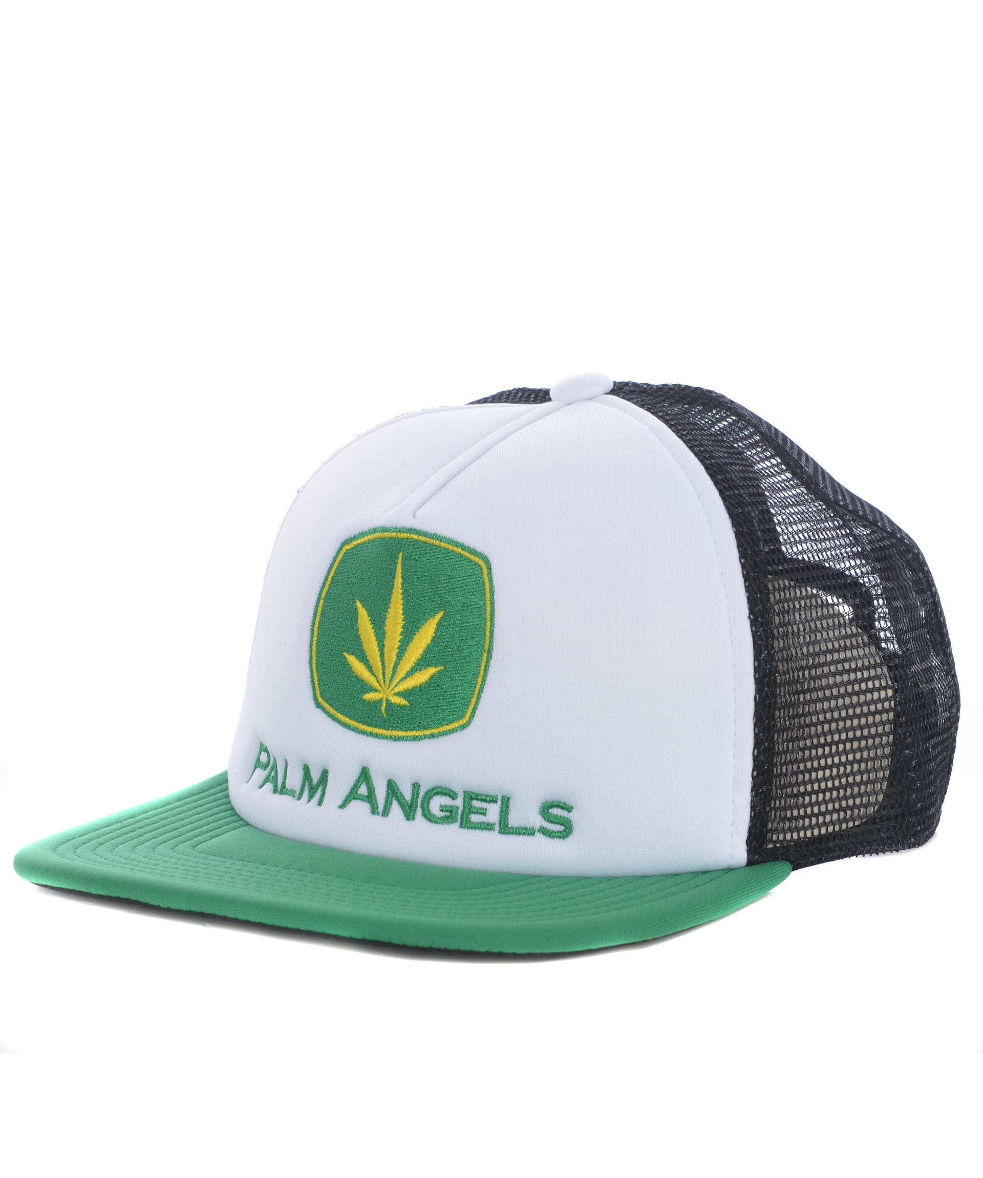 Cappello baseball Palm Angels in cotone Bianco e Verde. Inserto sul retro in rete Nera. Logo frontale ricamato. Regolabile sul retro. Misura in foto Unica 100% cotone