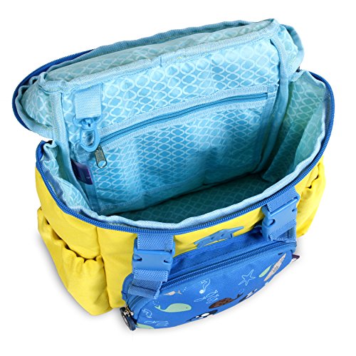 J World Kinder Kids' backpack features a front utility pocket, adjustable shoulder straps, air mesh cushioned back, interior pocket organizer, and padded grip handle.