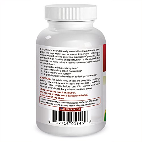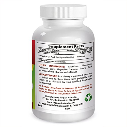 -. Binding : Health and Beauty -. Brand : Best Naturals -. Feature : Provides vital support for your immune system -- Promotes your overall cardiovascular system vitality / Reduce healing time for bone and other injuries --Supports Healthy Blood Pressure / Arginine promotes Nitric Oxide production, which helps support circulation and muscles / Arginine may help stimulate the activity and increase the size of the thymus gland which begins to decrease in size after puberty. Arginine is known to stimulate white blood cell production. / All Best Naturals products are manufactured in accordance with Good Manufacturing Practices (GMP), among the highest standards in the world -- Proudly Made in USA -- Purity & Potency Guaranteed -. Label : Best Naturals -. Manufacturer : Best Naturals -. ProductGroup : Health and Beauty -. ProductTypeName : HEALTH_PERSONAL_CARE -. Publisher : Best Naturals -. Studio : Best Naturals -. Title : #1 L-Arginine 1000mg 120 Tablets by Best Naturals - Essential Amino Acid - Cardiovascular Health Support Formula - L Arginine Enhances Circulation - Lifetime 100% Satisfaction Money Back Guarantee - Manufactured in a USA Based GMP Certified Facility and Third Party Tested for Purity. Guaranteed!!