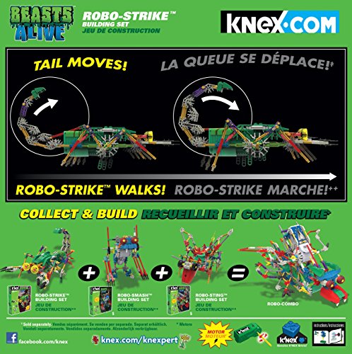 -. Binding : Toy -. Brand : K'Nex -. Department : unisex-child -. EAN : 5054480507493 -. Feature : Build Robo-Strike in the Robo-Creatures series|Motorized with 163 K'NEX parts| / Combine all the sets in the series to create the ultimate creature (each set sold separately) / |Requires 2 "AA" batteries, not included|For ages 7+ / The motor allows for unique and exciting mechanical movement / Motorized with 163 K'NEX parts / Requires 2 "AA" batteries sold separately / For ages 7+ / Includes 163 K'NEX parts, P.R.Imarily rods & connectors -. IsAdultProduct : 0 -. IsAutographed : 0 -. ItemPartNumber : 13201 -. Label : K'NEX -. LegalDisclaimer : AGES 7 AND UP CHOKING HAZARD - SMALL PARTS NOT FOR CHILDREN UNDER 3 -. Manufacturer : K'NEX -. Model : 13201 -. MPN : 13201 -. NumberOfItems : 1 -. PackageQuantity : 1 -. PartNumber : 13201 -. ProductGroup : Toy -. ProductTypeName : TOYS_AND_GAMES -. Publisher : K'NEX -. ReleaseDate : 2013-01-01 -. Studio : K'NEX -. Title : K'NEX Robo Strike Building Set -. UPC : 885466374830 -. Warranty : 1-800-kid-knex