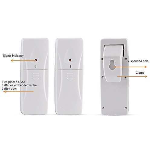 Power requirements: Main Unit - 2 x AAA(not included) 2 Transmitters - 4 x AA (not included) Note: 1.Do not install the reverse battery 2.Do not put the receiver near metal 3.Avoid transmitter directly in the rain 4.High-quality batteries for the use of main unit and transmitter better 5.The sensor search mode allows you to re-sync sensors without removing and re-inserting batteries.