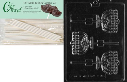 Cybrtrayd Menorah Lolly Chocolate Candy Mold with 25 4.5-Inch Lollipop Sticks and Exclusive Cybrtrayd Copyrighted Chocolate Molding Instructions