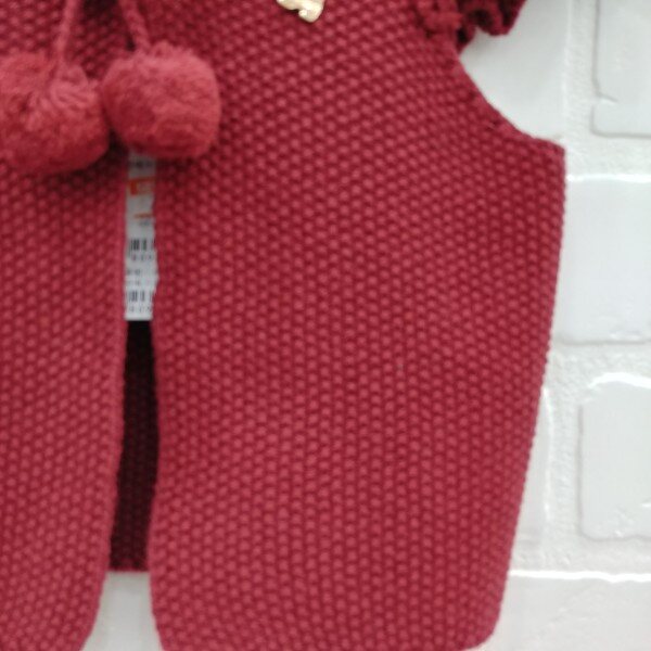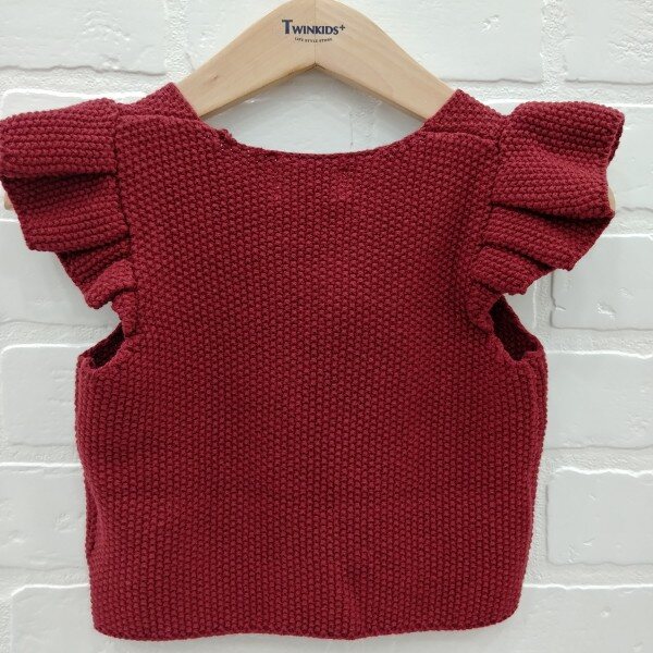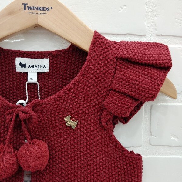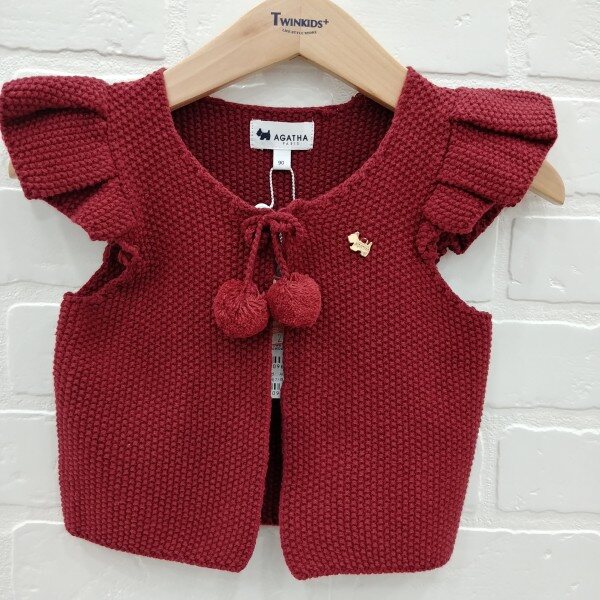 어깨 프릴과 목 에리에 리본,퐁퐁이 장식이 들어간 여아 니트 조끼, 아가타 벨 장식이 포인트로 들어감.