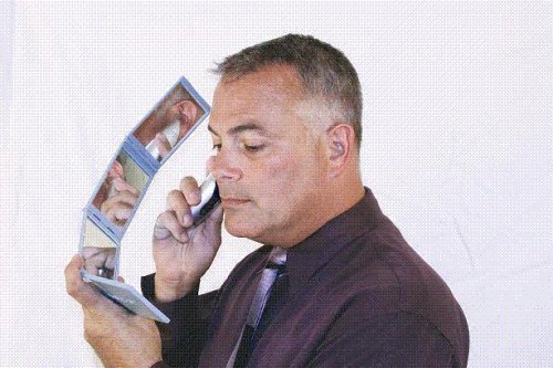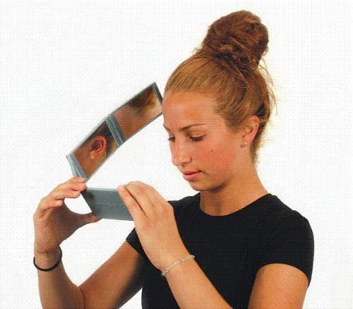 Product is a 4-fold expandable foldable hand-held mirror compact with hinges that "hold" their respectable positions (making one-hand use possible and easy). The new, patented 4-fold mirror compact assembly known as the Mirror Go Round (TM) has many obvious uses and is particularly useful for seeing: inside your own ears, behind your ears, around your neck, back of head, top of your head, hairline, all hair accessories (such as barrettes, hair clips, wraps), etc, etc, etc. For anyone who takes their grooming seriously this item is an absolute must-have. The Mirror Go Round is also very useful and capable of seeing other hard-to-see areas on your entire body. Owning the Mirror Go Round you should never need to use two separate mirrors to get that special angle one just cannot get. This item is perfect to have in your overnight bag, glove compartment, and of course in your home. Due to its rugged construction the patented Mirror Go Round (TM) can also be used as a hands free standing mirror (see picture), making it perfect for your desk, workplace or even on an airplane. Patrons have expressed its ease of use when applying makeup and/or attending to contact lenses (where a mirror and 2 hands would be most beneficial). The Mirror Go Round (TM) is also an ideal product to have around in any workshop atmosphere. You can now easily see up and around and behind things. Some of the user testimonials include: seeing around ductwork, seeing behind stereo and TV components for wiring purposes, seeing around engines and other automobile nooks, ideal for on top of your computer to see who's nearby, and an extremely affordable valuable new product ("can't believe there's nothing like this already out there"). The new applications are being discovered daily. The Mirror Go Round (TM) is one of America's fastest growing products and makes the perfect gift for any man or woman. Get yours and see things from a whole new angle!