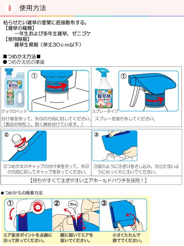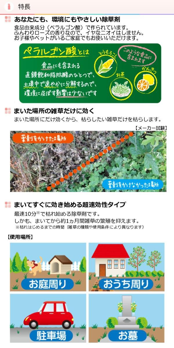 食品成分(ペラルゴン酸)から作られた除草剤です。この商品は「みんなにやさしい除草剤おうちの草コロリふんわりローズの香り」の詰替用で、持ちやすく詰替えやすいエアホールドパウチを採用しています。 |
