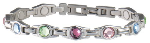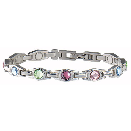 Cubic zirconia gems in four colors set in a polished stainless steel bracelet that is perfect for dress or casual wear. This bracelet will be a favorite because it is so versatile! A 1200 gauss magnet is in each link.Feature